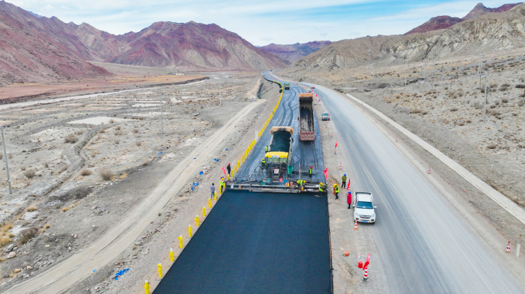 G315线托帕至吐尔尕特口岸公路建设项目路段正在铺设沥青。