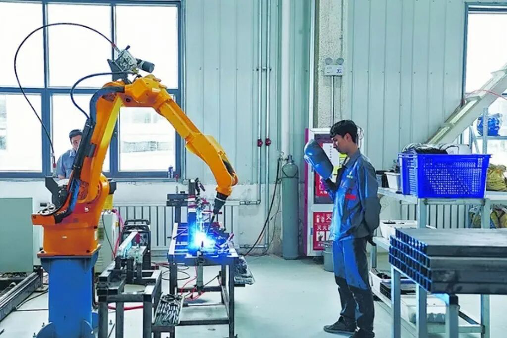 无锡产业园新疆苏匠车业有限公司车间内,员工正在查看全自动焊接机械手焊接车架的情况。