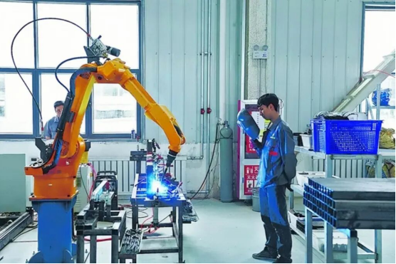 新疆苏匠车业有限公司车间内,员工正在查看全自动焊接机械手焊接车架的情况。