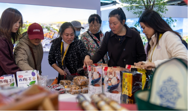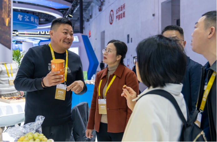 走进新疆展馆,浓郁的地域风情裹挟着美食香气扑面而来。无花果干果肉饱满、巴仁杏果香馥郁、牛羊肉肉质鲜嫩、沙棘制品酸甜可口、刺绣精美别致,整齐陈列的各类特色产品引得观众驻足流连。