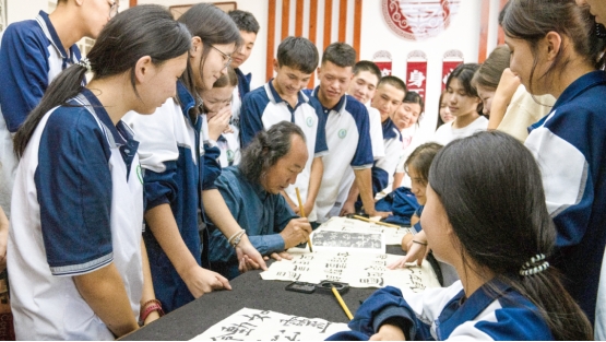 走进克州第三中学,教学楼大厅的走廊里陈列着学生的书画作品。课间时分,这里成为大家的文化乐园,笔墨丹青间悄然凝聚着对中华优秀传统文化的认同。该校以“儒学馆”为地标,成立书法、汉服、话剧等传统文化社团,常态化开展“艺术节”“谷雨诗会”等活动,累计参与师生超1.2万人次;2名学生在自治区第六届“华文杯”中小学生书法大赛中分别获得一、三等奖。今年9月,新疆书法家协会副主席马亚飞为艺术班学生授课,从握笔姿势到笔画韵律细致讲解,让学生沉浸在墨香雅韵之中。高二学生古丽米拉·巴衣巴拉感慨:“马老师不仅教会我们书写技巧,更让我们深刻体会到书法的魅力。”
