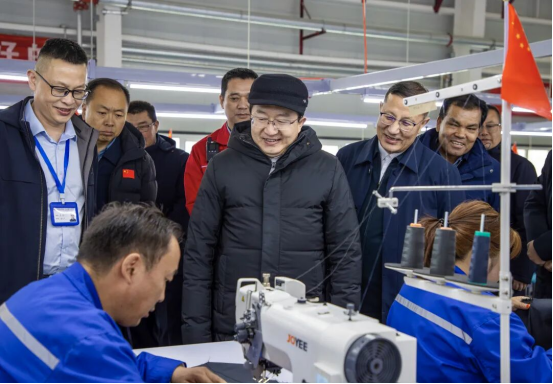 1月18日,州委书记王学东,州委副书记、州长吾肉孜阿力·哈西哈尔巴依在阿合奇县中顺服装有限责任公司调研企业生产经营情况。全媒体记者张令摄