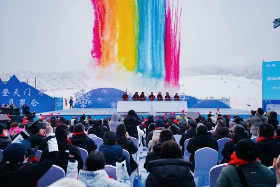 漫天飞雪的滑雪场,并未因严寒消减分毫热度,八方游客的热情将活动现场烘得暖意融融。开幕式上,活力四射的开场舞瞬间点燃全场气氛。随着活动开幕的指令下达,数道彩烟陡然升空,滑雪健儿们手擎国旗,从皑皑雪山顶峰疾驰而下,现场欢呼声、喝彩声此起彼伏,久久回荡。
