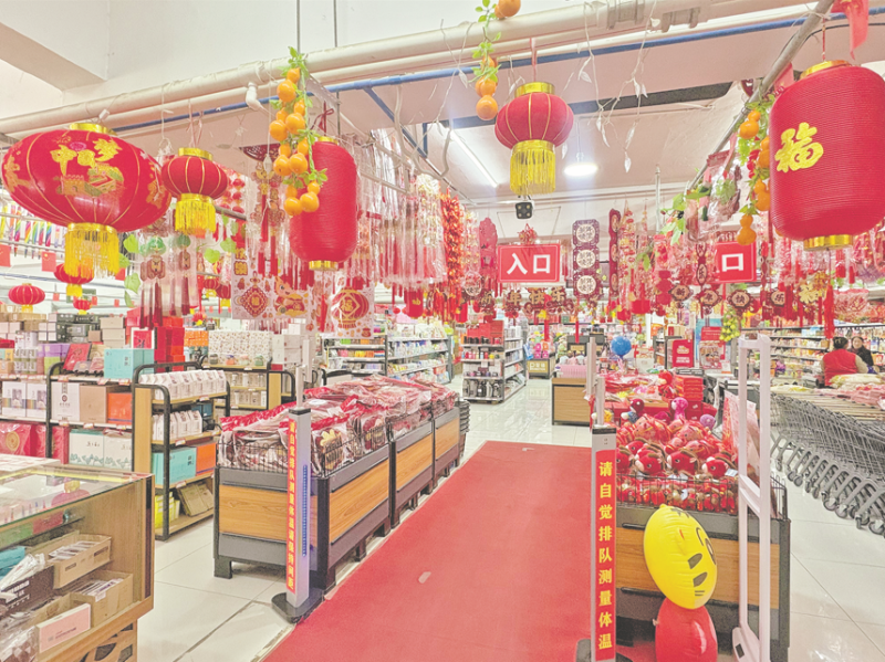 在驼铃商超,喜庆的“中国红”贯穿全场,春联、灯笼、福字等节庆用品整齐陈列在入口显眼位置,便于市民挑选。为助力本地农副产品产销对接,商超设立本地特色农产品专区,精选本地优质粮油、新鲜果蔬、特色小吃等产品集中展示,让群众在家门口就能买到地道的好物,推动本地优质农产品走出乡村、走进市场、走进千家万户。