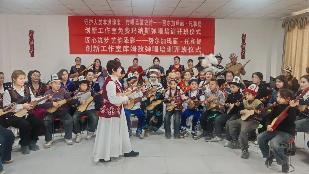 培训班课程设置贴近生活,内容涵盖《玛纳斯》史诗的基本唱段与唱腔技巧、库姆孜弹奏的基础指法与常用曲调解析。采用“老带新、师带徒”方式,邀请村中老艺人和民间乐手担任指导老师,面对面教、手把手带。