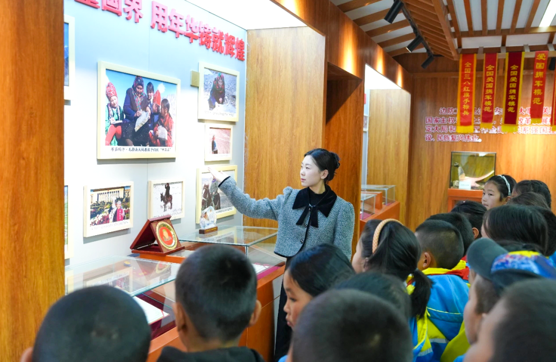 吉根乡人民政府宣传办主任李雅轩在吉根乡爱国戍边精神传承教育基地给参观学生讲解戍边故事