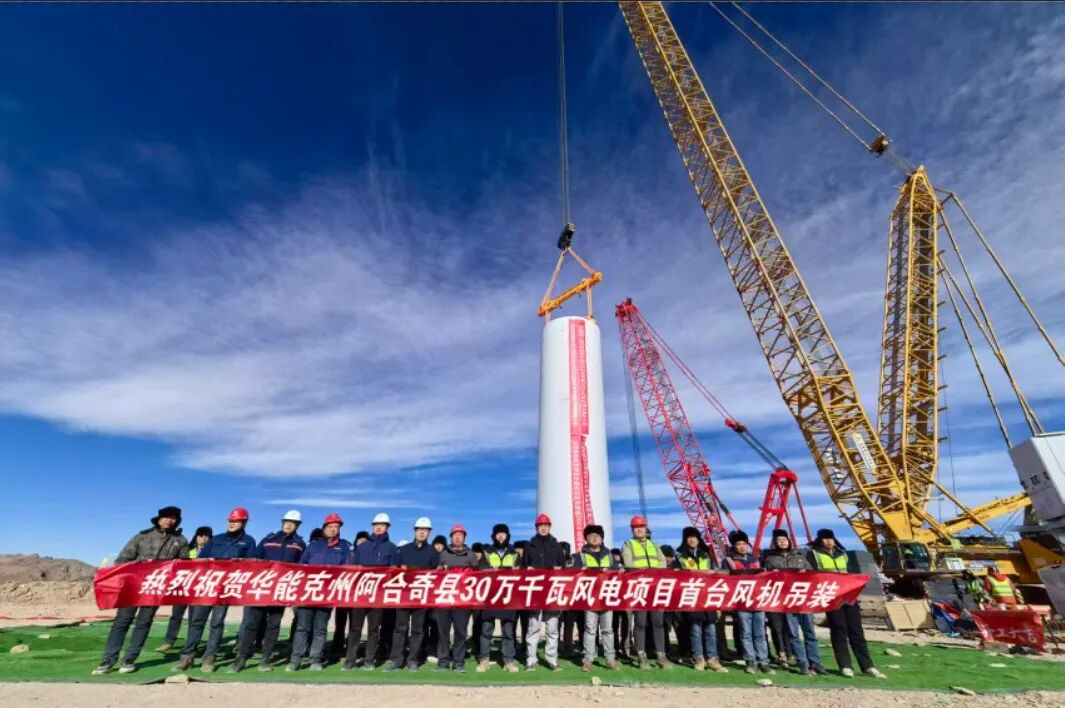 风机塔筒下,中国华能阿合奇县30万千瓦风电项目土建、物资专责王东亚正叮嘱吊装叶片的工人注意安全。身后“中国华能”的标识在高原蓝天的映衬下格外醒目。他说:“我们在这里是为了把帕米尔高原的风,转化成点亮千家万户的‘绿电’。春节用电高峰,保障清洁能源稳定输出,是我们的职责。”