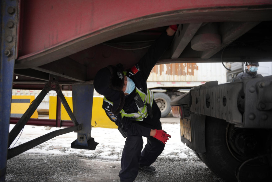 执勤民警对出入境车辆进行车体检查