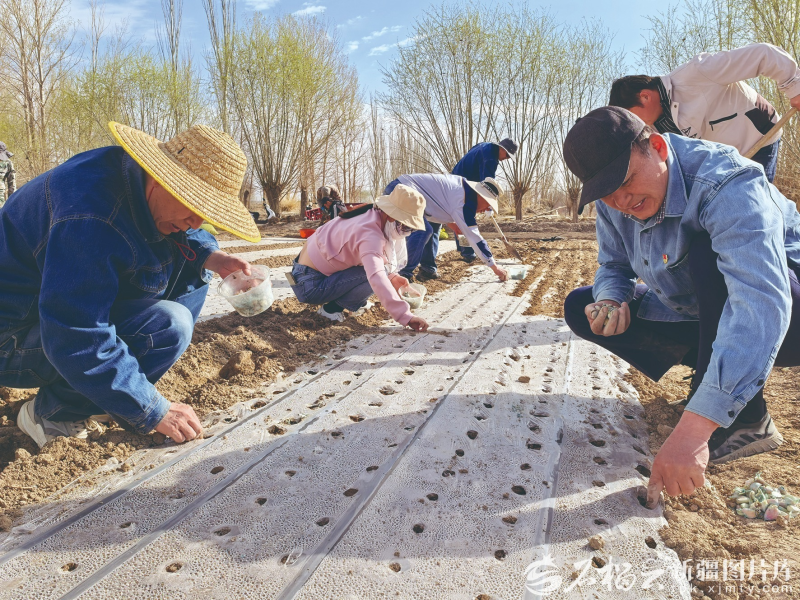 华能新疆公司驻别迭里村工作队队员与村民一起种植药用大蒜。华能新疆公司驻别迭里村工作队供图