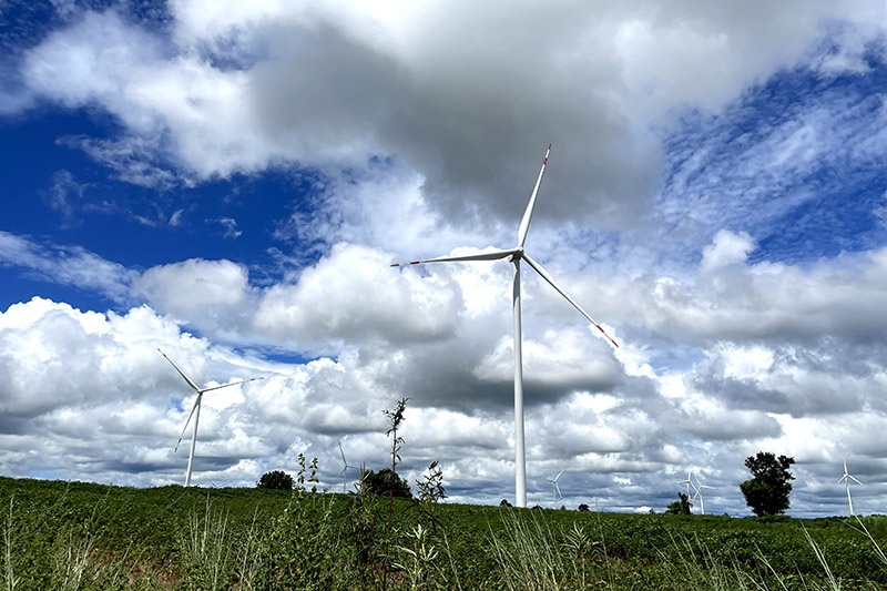 这是2022年10月4日在泰国猜也蓬府拍摄的由中国金风科技提供的风力发电机。新华社记者 宋宇 摄