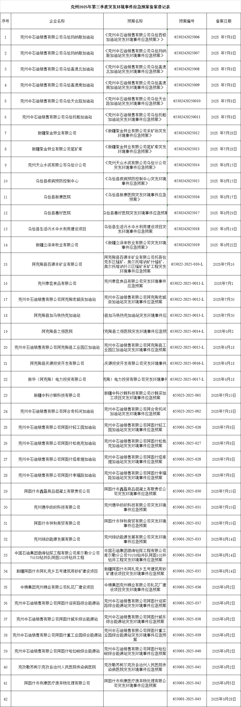 克州2025年第三季度突发环境事件应急预案备案情况