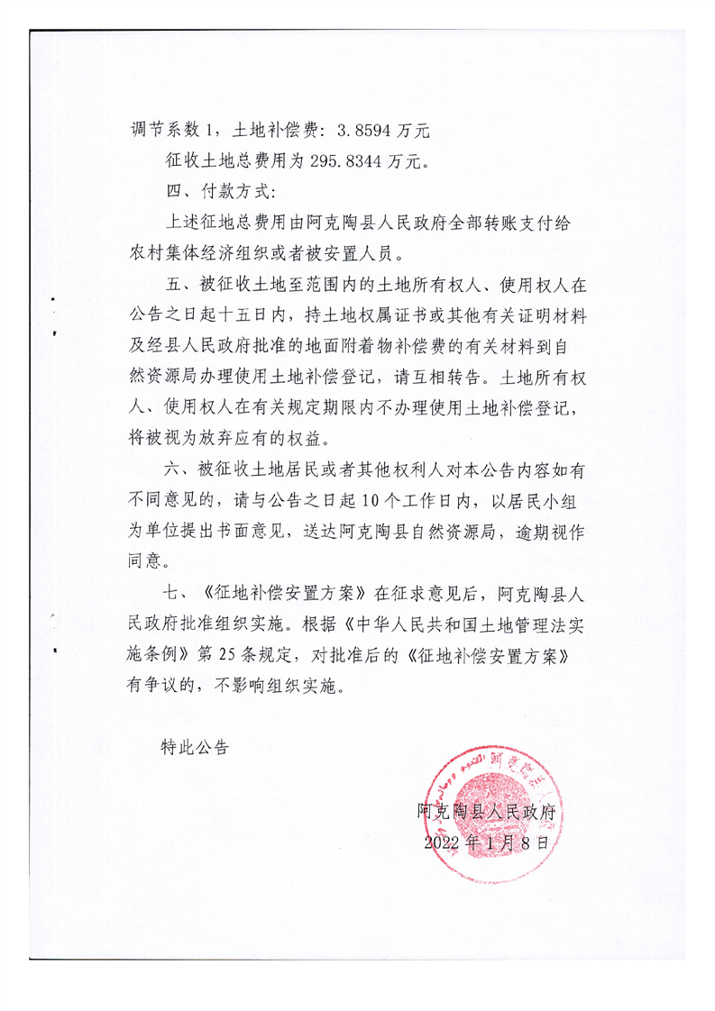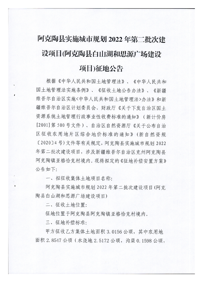 阿克陶县实施城市规划2022年第二批次建设项目(阿克陶县白山湖和思源广场建设项目)征地公告
