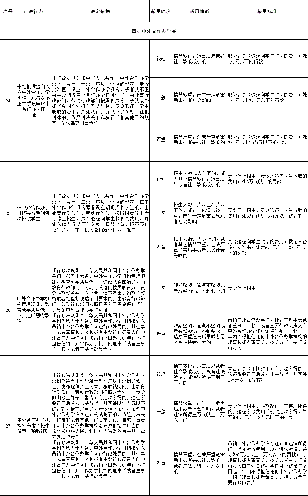 新疆维吾尔自治区 新疆生产建设兵团教育行政处罚裁量权基准(中外合作办学类)