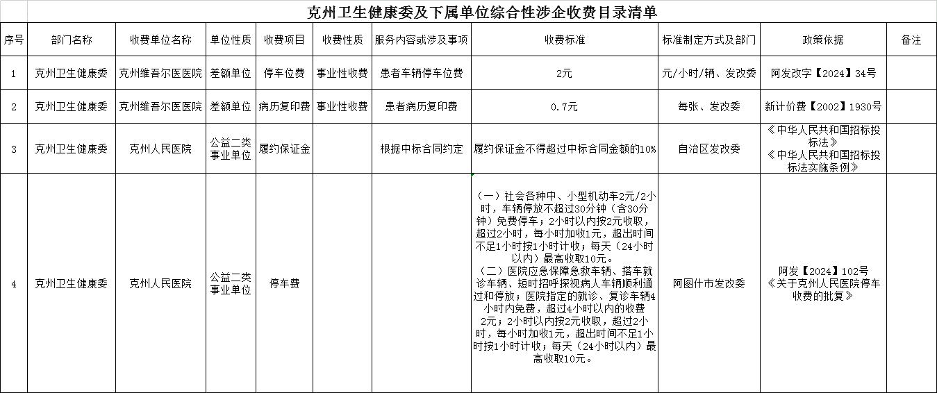 克州卫生健康委及下属单位综合性涉企收费目录清单