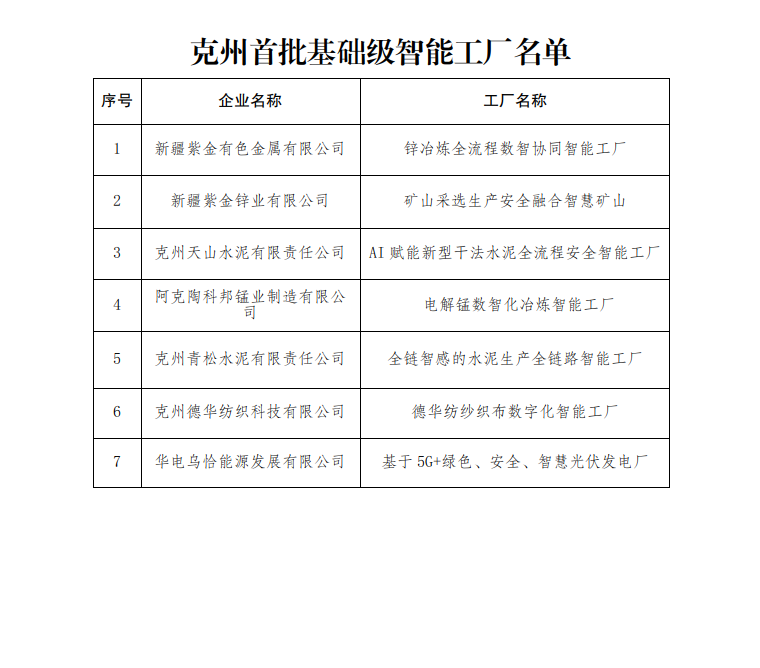 按照工业和信息化部、国家发展改革委、财政部、国务院国资委、市场监管总局办公厅、国家数据局综合司关于印发《智能工厂梯度培育管理办法(暂行)》(工信部联通装〔2025〕262号和自治区工信厅《关于开展2026年度智能工厂梯度培育工作的通知》(新工信装备〔2026〕4号)相关要求,经企业自愿申报、邀请专家实质性审查、公示等,复核通过基础级智能工厂7家。现将克州首批基础级智能工厂入选名单予以公布。