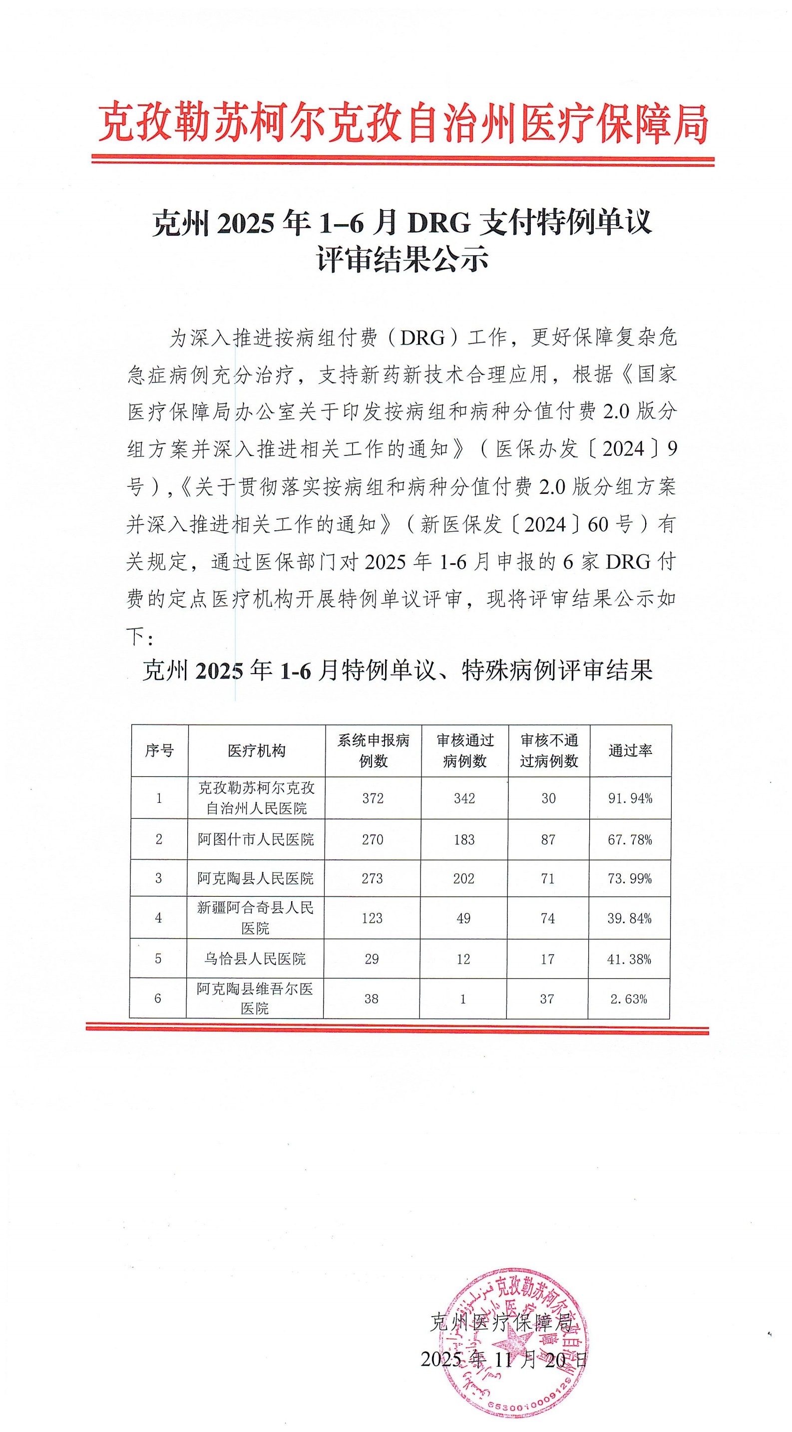 克州2025年1-6月DRG支付特例单议评审结果公示