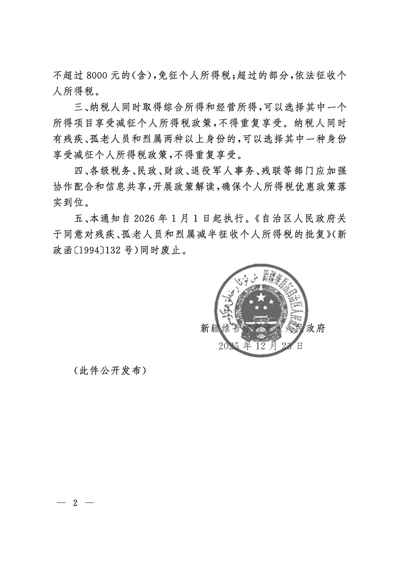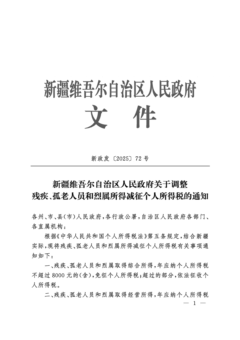 新疆维吾尔自治区人民政府关于调整残疾、孤老人员和烈属所得减征个人所得税的通知