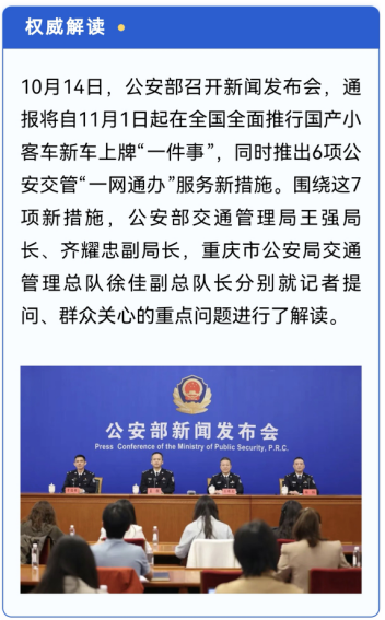 第三,是坚持便民惠企。通过应用“交管12123”APP,创新整合购车购险和缴税上牌等服务,群众足不出户即可完成线上全流程办理,牌证邮寄到家。新车上牌时间从原来的半天大幅缩短至30分钟以内,需提交的7项材料精简为“零”。我们会同相关企业加强措施宣传、解读和提示,让更多群众享受到便利措施。可以说,新车上牌“一件事”服务提升了用户体验,增强了汽车市场活力,有效助力汽车消费稳步增长,为优化营商环境贡献了公安力量。