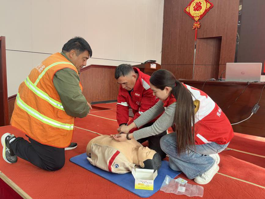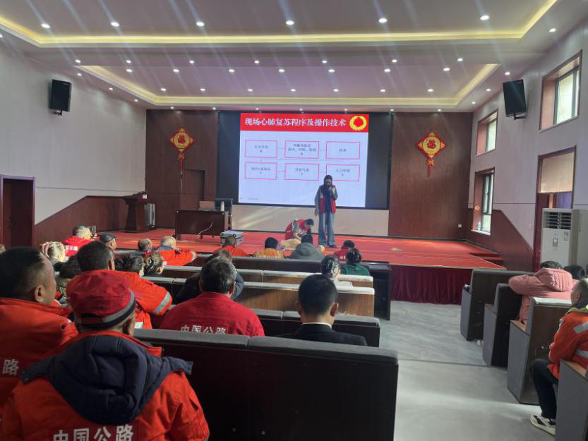培训聚焦公路养护场景高频风险,针对性设置课程内容,采用“理论讲解+实操演练+考核”模式,结合公路养护真实案例拆解应急要点,重点讲解心肺复苏、创伤包扎、常见急症处置、避险逃生技巧、触电、中暑、蛇虫叮咬等公路养护常见意外处置原则与流程。现场组织学员分组练习心肺复苏、止血包扎等技能,确保每位学员熟练掌握核心救护方法。学员们两两一组,互相练习,现场学习氛围热烈。